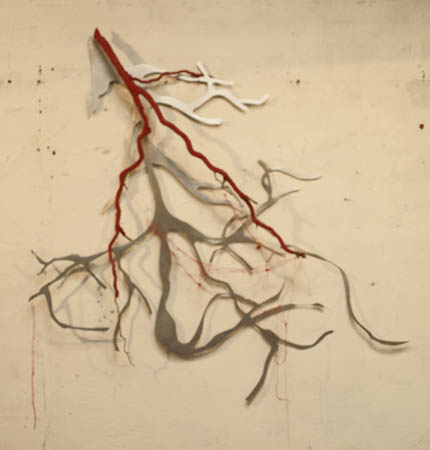Al final de su texto de presentacion en el catálogo editado con motivo de esta ultima individual de Patricia Azcarate en Madrid, Jose María Parreño lo resume con elegante precisión: "De la tierra al agua, del agua al aire, enarbolando una bandera de raíces. En esta situación esta una pintora que necesito algo mas que el lienzo (madera, metal, cristal, esponjas) para seguir adelante". Porque, en efecto, resumiendo, la evolución de su trayectoria en los ultimos años ha llevado a Azcárate a desplegarse por vastos ciclos temáticos, protagonizados primero por una clara alusión a las fuerzas telúricas y la imagen terrestre, para, en posterior etapa, que culminaba hace tres afios, sumergirse de lleno en las alusiones al medio acuático, los flujos y mareas del agua, sus ondas y Corrientes, sus mareas... Fue justo en ese momento cuando su trabajo supero los límites pictóricos, con la incorporación del objeto y la instalacion que, ahora, cuando le toca el turno al aire, vuelven a estar presentes tomando como pretexto la imagen de ramas y copas de arboles, hojas, arrastres ventosos, rizos, brisas.